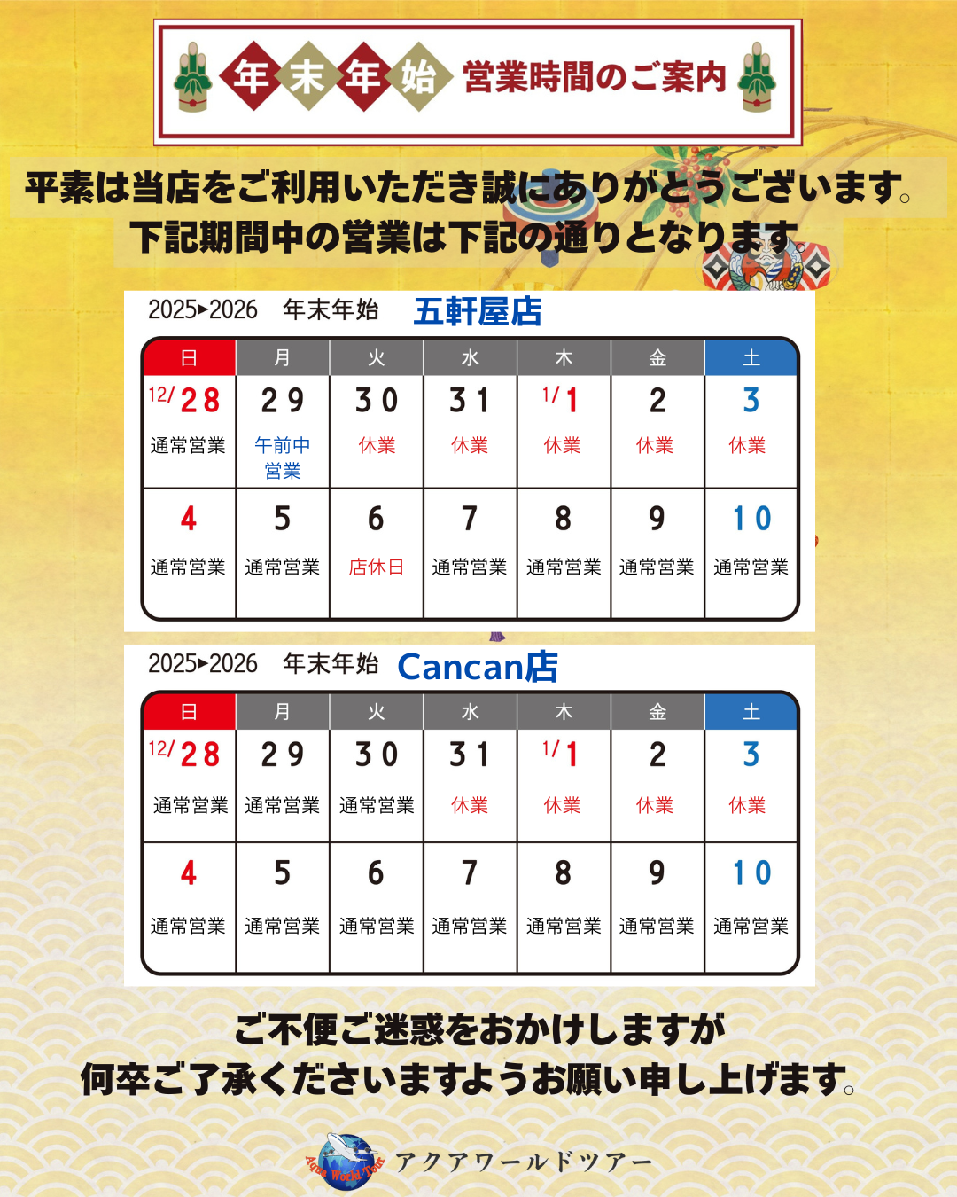 NEW2025.12.21 2025年→2026年 年末年始営業時間のご案内 平素は当店をご利用いただき、誠にありがとうございます。 年末年始の営業時間のご案内です。 休業中は、ご不便ご迷惑をおかけいたしますが、何卒ご了承くださいますよう、よろしくお願い申し上げます。 シェアするShare おすすめ一覧